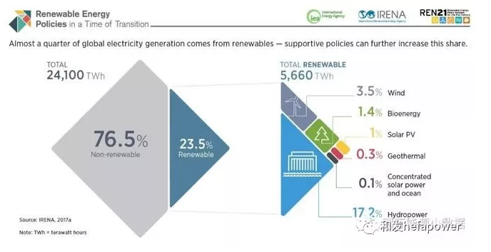 根据国际可再生能源署(IRENA)的数据,2017年全球发电量24万亿千瓦时,其中23.5%来自可再生能源电源(5.66万亿千瓦时)。