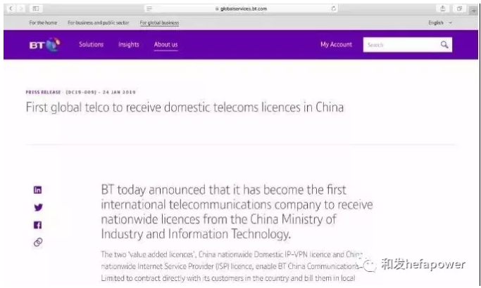 前不久,英国电信官网显示:英国电信已经拿到第一张中国通信运营的牌照,将成为第一家正式进入中国通信行业的外国企业。。。工信部也正式宣布:英国电信(BT)获得了在中国全国性经营通信的牌照。。。